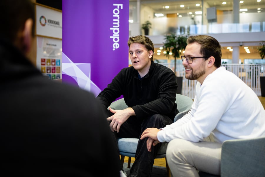 "Det bedste ved at være i praktik hos Formpipe er, at man ikke bare arbejder på hypotetiske opgaver – det man laver, bliver virkelighed og bruges af vores kunder i deres daglige arbejde. Vi har fået lov at arbejde med det samme produkt i praktikken, videre under bacheloren og nu som fastansatte - det giver nogle helt særlige muligheder. Lige nu er vi f.eks. nået til det mega spændende tidspunkt, hvor vi skal teste produktet hos vores første kunde. Det er både spændende og lidt nervepirrende, at vide, at dét, vi har arbejdet så koncentreret på nu rent faktisk skal bruges af en masse mennesker", fortæller Lukas og ser over på Christoffer, der nikker samstemmigt.